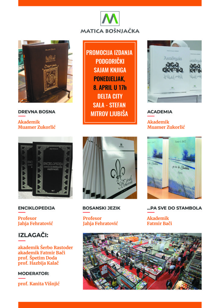 U ponedjeljak, 8. aprila u 17 časova, na 14. Podgoričkom sajmu knjiga održat će se promocija izdanja Matice bošnjačke, među kojima su Drevna Bosna i Academia autora akademika Muamera Zukorlića, Enciklopedija sandžačkobošnjačke književnosti i Udžbenik Bosanskog jezika autora dr. Jahje Fehratovića, Novele …pa sve do Stambola autora akademika Fatmira Bačija, te drugih izdanja.
